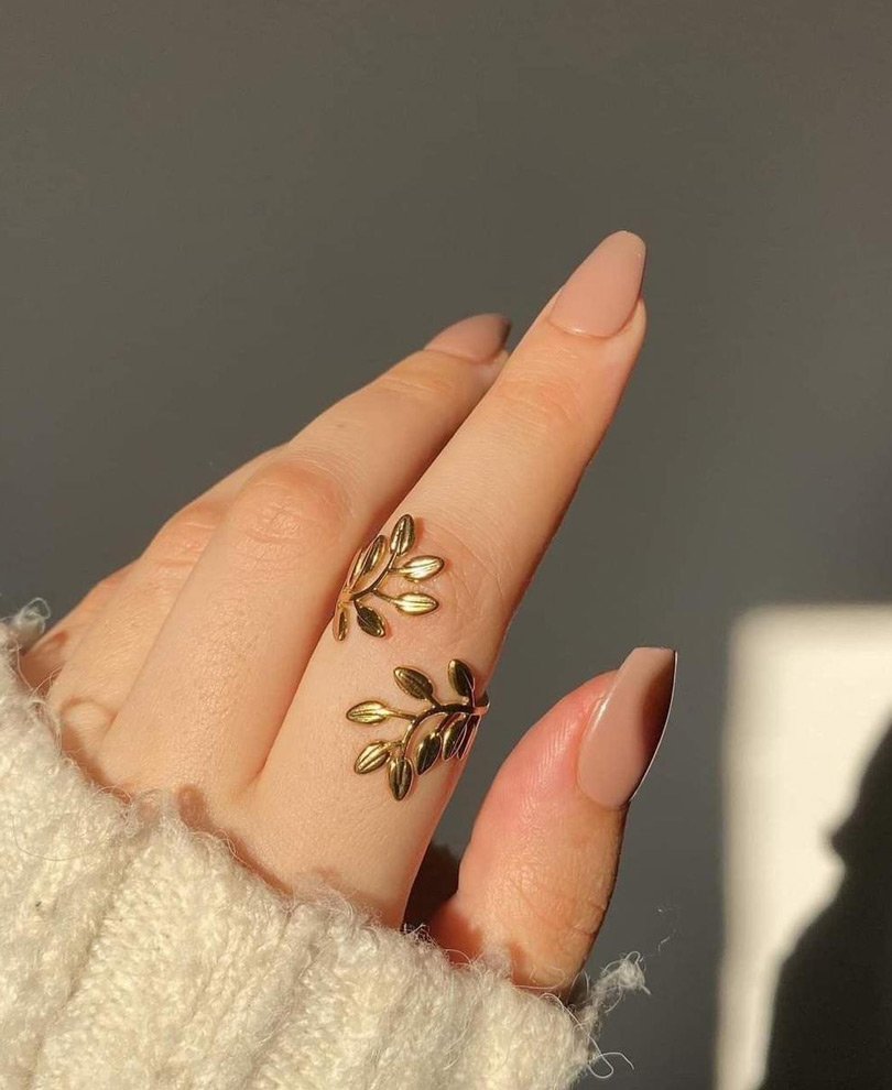 A stylish open-ended ring adorned with twin leafy branches that wrap gently around the finger. Crafted in gold, this nature-inspired design offers both comfort and beauty—ideal for daily wear or special occasions.