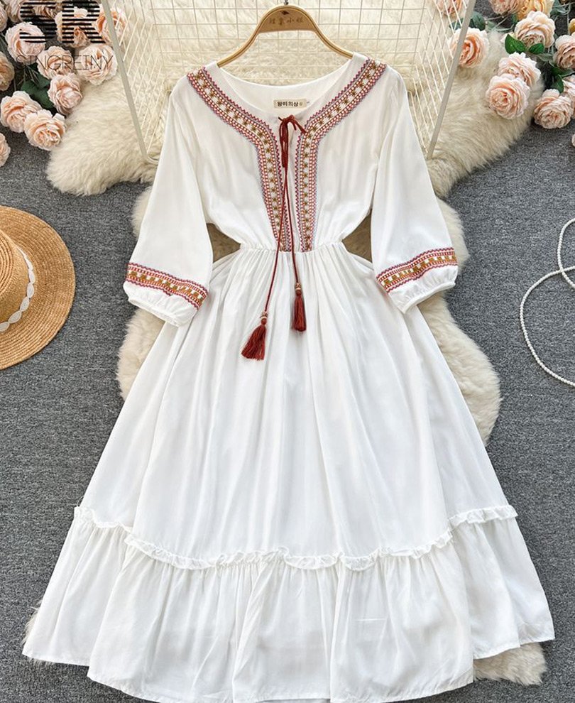 Bohemian Tassel Midi Dress – White with Tribal Accents