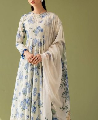This graceful Anarkali-style dress features soft blue floral prints on a creamy base with intricate embroidery around the neckline. Paired with a sheer matching dupatta, it reflects timeless elegance suitable for festive and formal occasions.