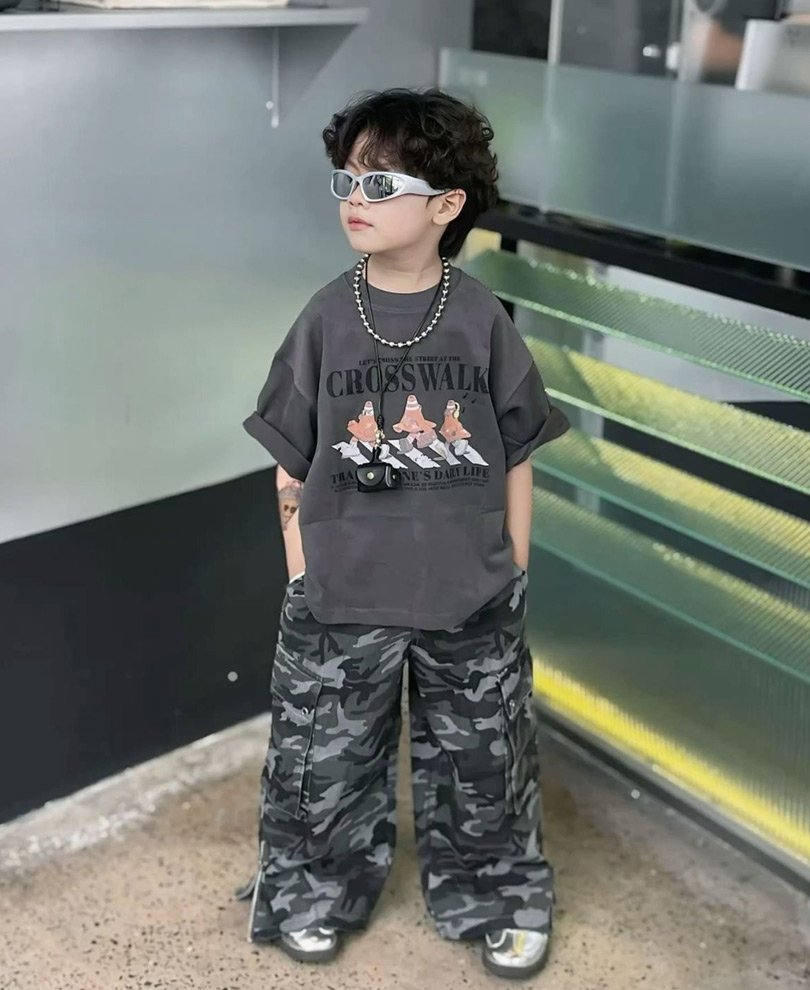 A dark charcoal tee with cartoon print is styled with wide-leg camouflage pants. Statement sneakers, bold eyewear, and layered accessories complete this edgy, fashion-forward streetwear look.
