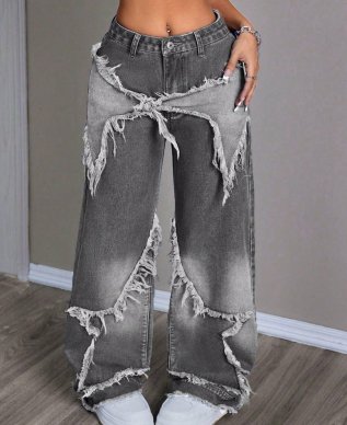 Featuring exaggerated ripped seams and a rugged, faded wash, these charcoal gray wide-leg jeans bring a rebellious flair to casual wear. The intricate distressed details form angular shapes that add dimension and a bold statement to any outfit.
