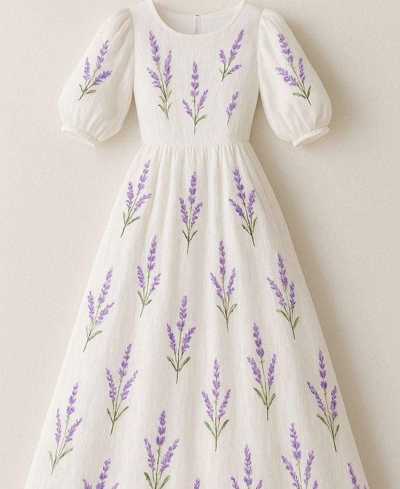 A charming white dress adorned with repeated lavender sprigs embroidery, creating a cottagecore vibe. The puff sleeves and gathered waist enhance its feminine and youthful silhouette.