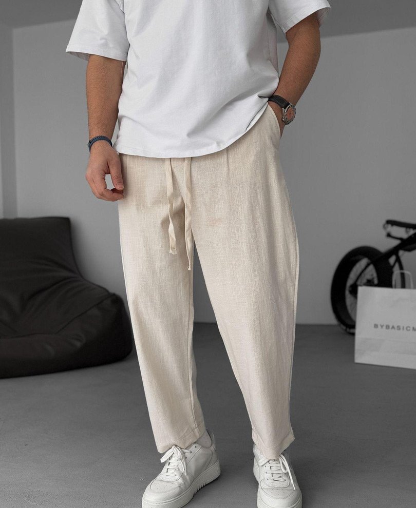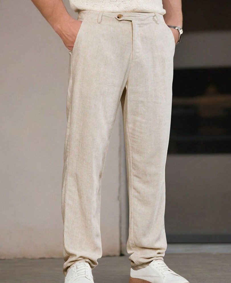 Add a bit of suave to your casual collection with this pair of solid trousers crafted from lightweight pure linen fabric. They feature an elasticated waistband with belt loops, a button closure, a zip fly and four pockets in a slim straight silhouette