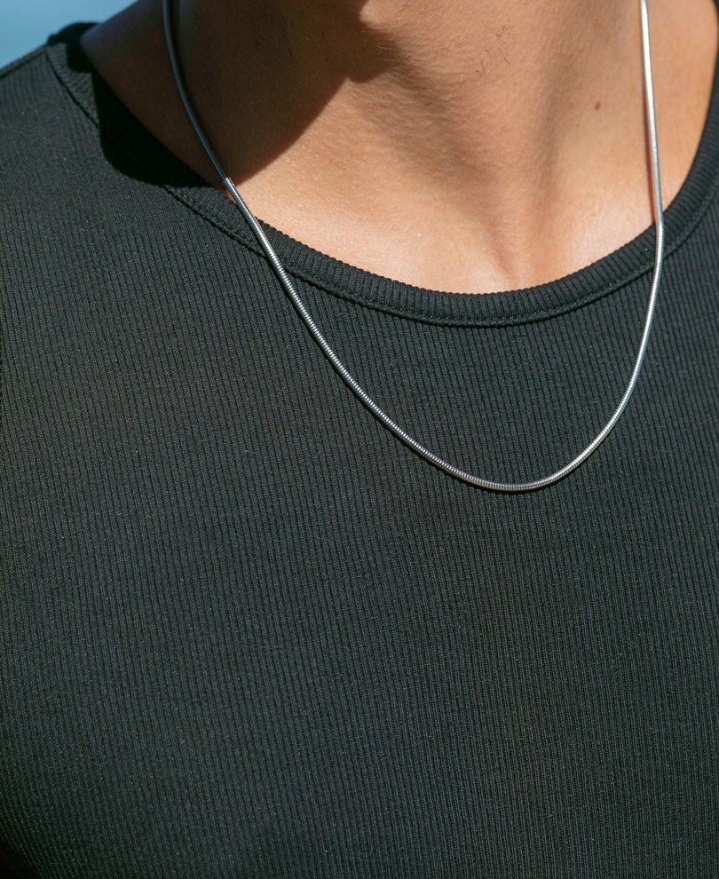 A sleek silver chain necklace, modern aesthetic.