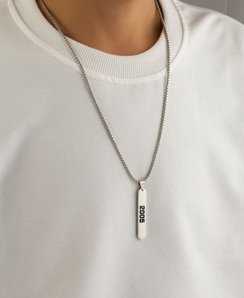 A stylish silver chain necklace featuring a rectangular pendant engraved with "2005," blending nostalgia with contemporary design