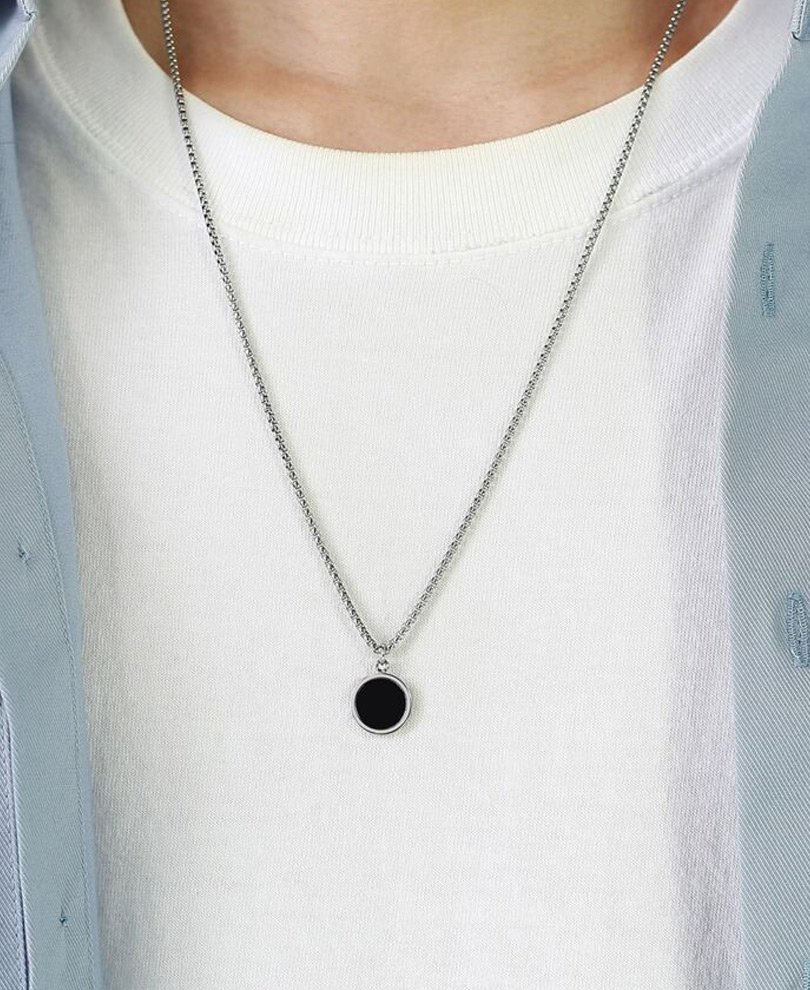 A simple silver chain necklace with a circular black pendant, offering a modern and understated look.