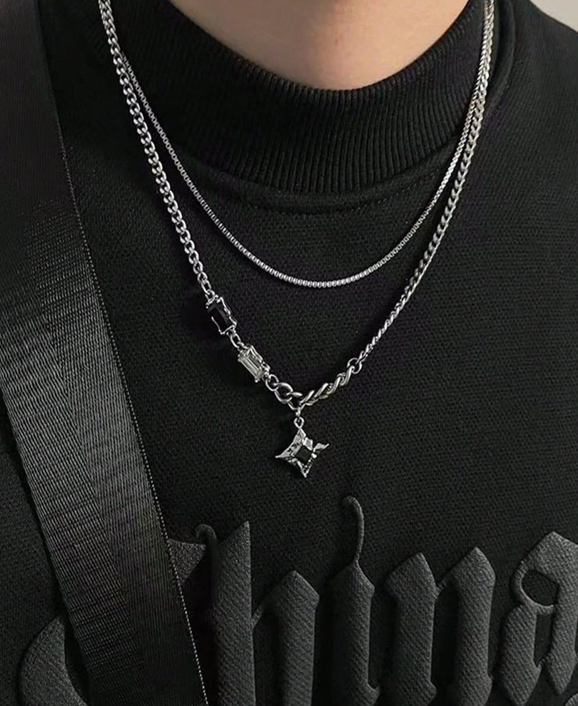 A sleek silver chain necklace featuring a bold star-shaped pendant with dark accents, paired with a thinner complementary chain